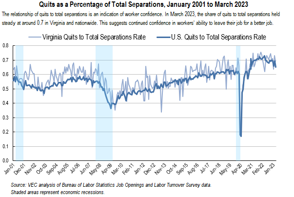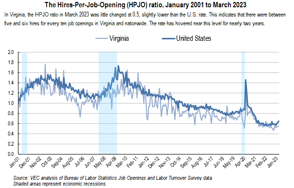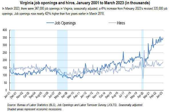RICHMOND— The Virginia Employment Commission announced today that the U.S. Bureau of Labor Statistics’ March 2023 Job Openings and Labor Turnover Survey (JOLTS) reports active job markets with strong rates of both job hires and job separations in the Commonwealth.