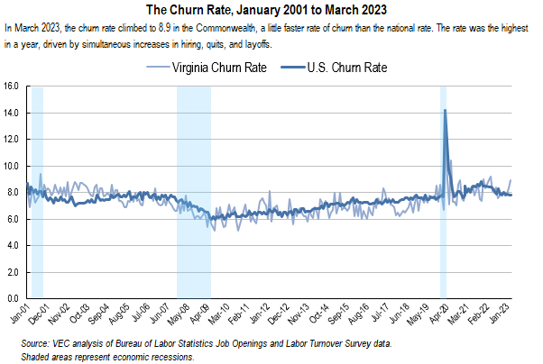 The March 2023 churn rate (the sum of the hires rate and the total separations rate) accelerated to 8.9 from February’s revised 8.3 rate in Virginia, indicating continued elevated velocity of rotation into and out of jobs, picking up pace slightly from recent months. Nationwide performed a little slower, as the U.S. churn rate was unchanged over the month and showed some deceleration over the year. An elevated churn rate indicates a labor market with a high hires rate, a high separations rate, or both. It can signify that workers are moving more frequently into and out of jobs in the labor market. Conversely, a low churn rate indicates a labor market with a low hires rate, a low separations rate, or both. Labor markets with the most churn may also have more seasonal employment patterns not fully captured by seasonal adjustment factors, which can lead to more frequent job-to-job movement.