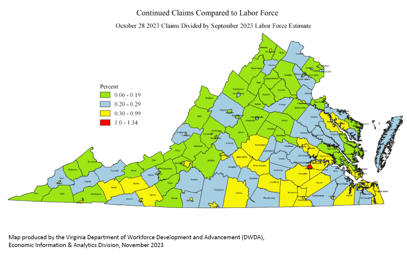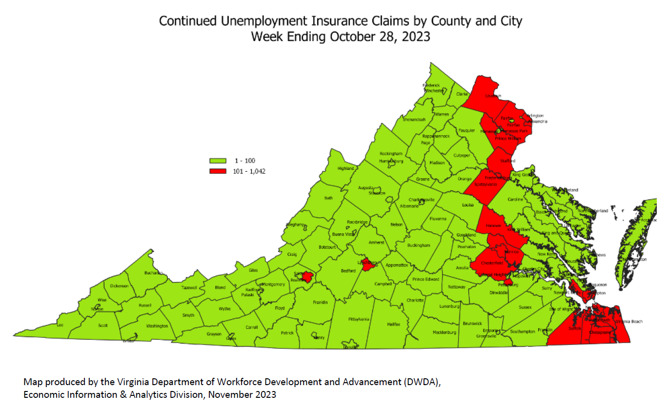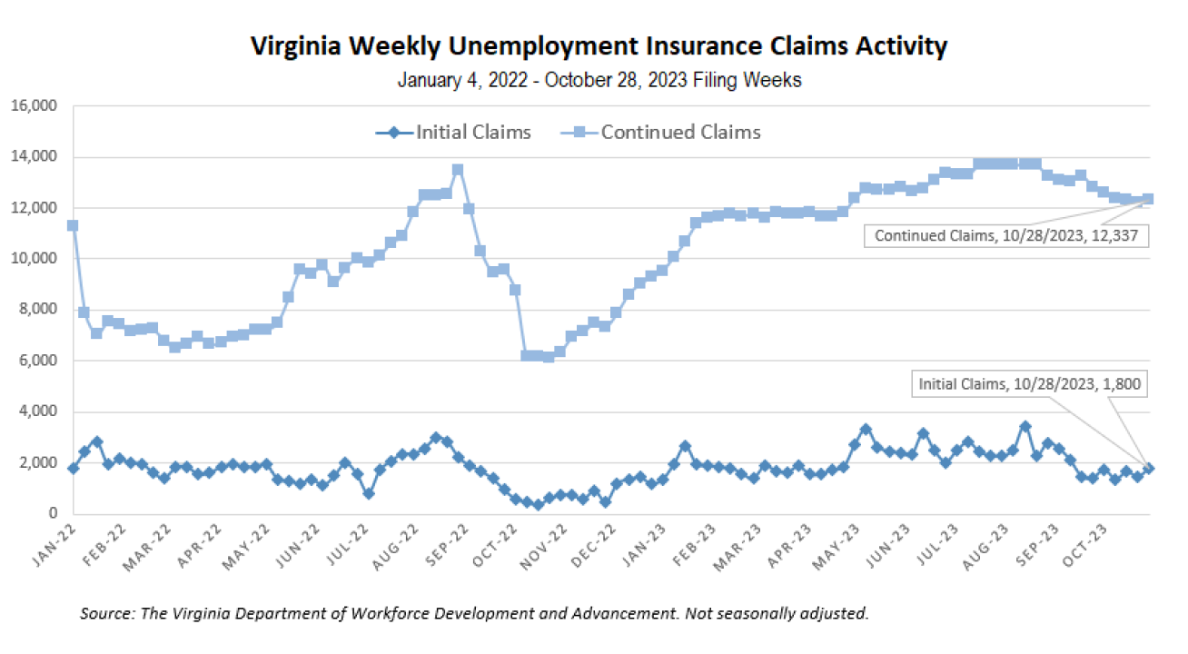 For the filing week ending October 28, the figure for seasonally unadjusted initial claims for unemployment insurance in Virginia was 1,800, which was an increase of 319 claimants from the previous week. Continued weeks claimed totaled 12,337, which was 133 claims higher than the previous week and an increase of 94% from the 6,375 continued claims from the comparable week last year. An industry was reported for ninety-three percent of continued claims. Of those, over half (53 percent) of continued claims were from professional, scientific, and technical services (1,875), administrative and support and waste management (1,683), manufacturing (1,507), and health care and social assistance (1,082). Eligibility for benefits is determined on a weekly basis, and so not all weekly claims filed result in a benefit payment. This is because the initial claims numbers represent claim applications; claims are then reviewed for eligibility and legitimacy.