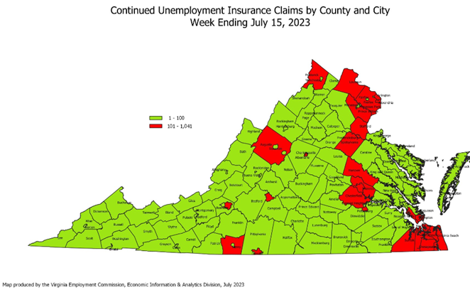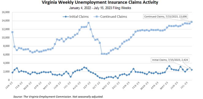 For the filing week ending July 15, the figure for seasonally unadjusted initial claims in Virginia was 2,424, which was a decrease of 392 claimants from the previous week. Continued weeks claimed totaled 13,696, which was 400 claims higher than the previous week and an increase of 28.8% from the 10,636 continued claims from the comparable week last year. Ninety-three percent of claimants self-reported an associated industry, of those reported over half (57 percent) of continued claims were from professional, scientific, and technical services (1,885), administrative and support and waste management (1,848), manufacturing (1,301), health care and social assistance (1,274), and retail trade (1,012).