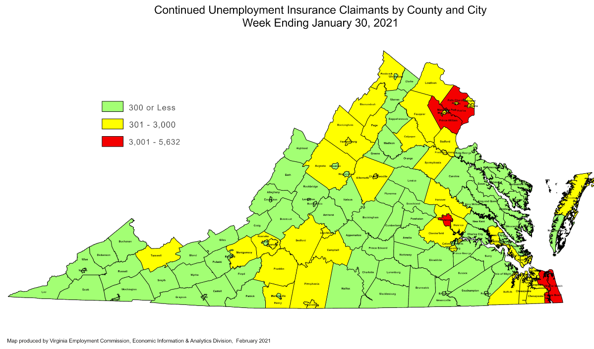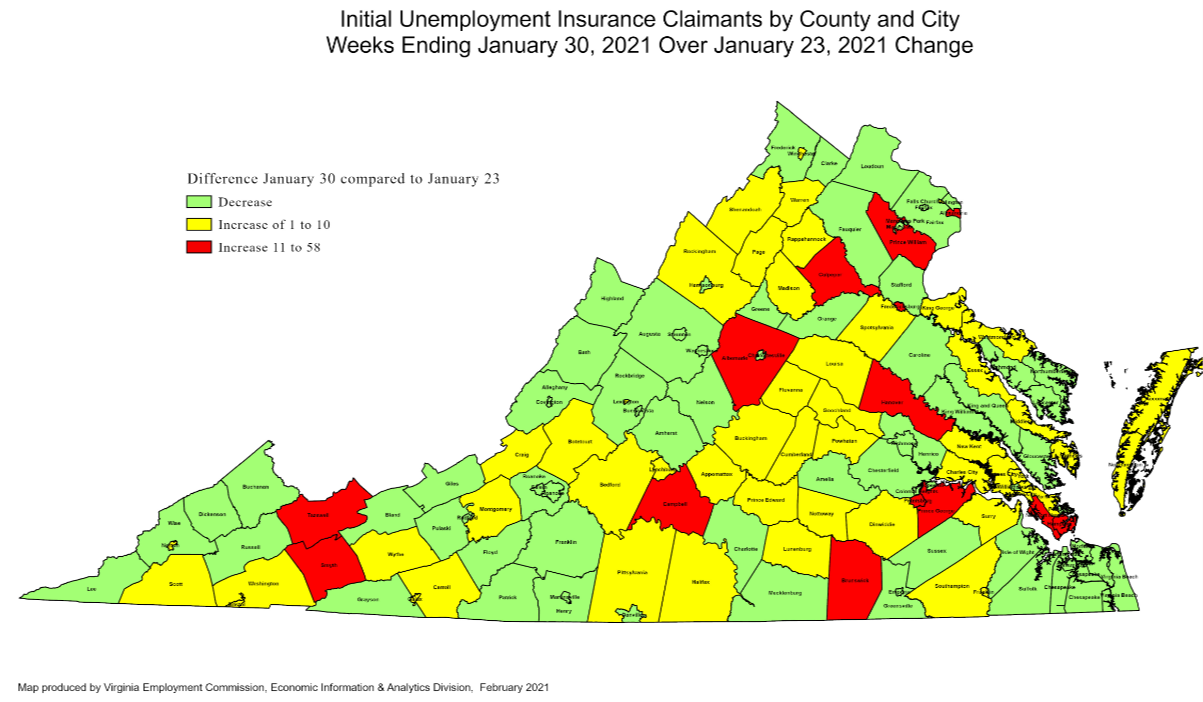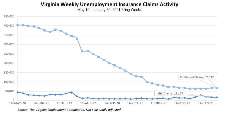 RICHMOND—The Virginia Employment Commission (VEC) announced that the number of initial claims filed during the January 30 filing week remained elevated when compared to recent months’ levels, according to figures released today.