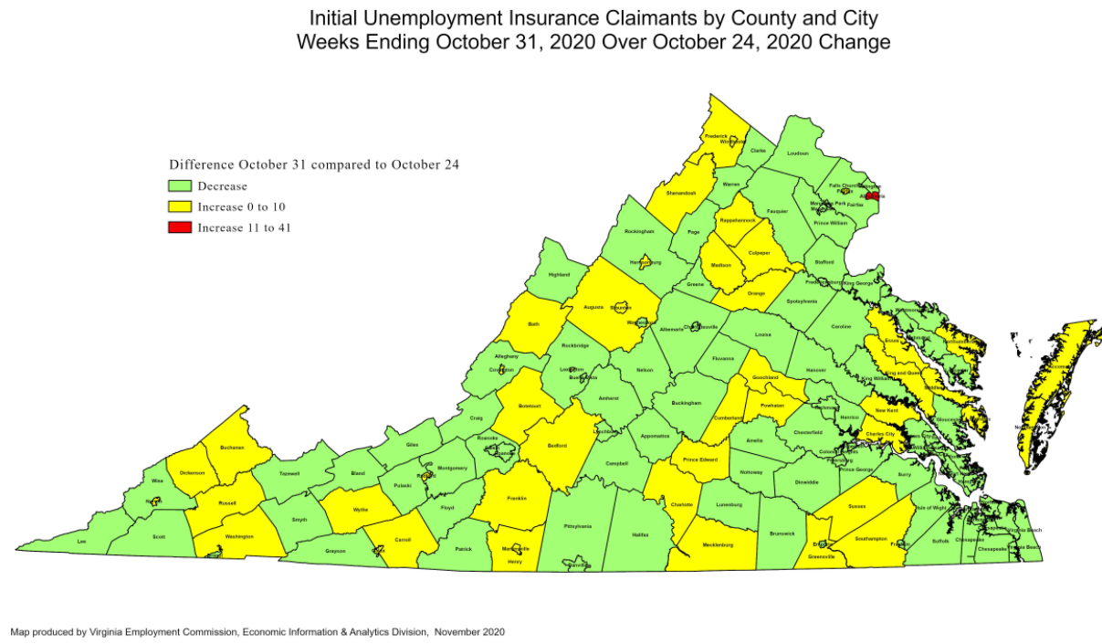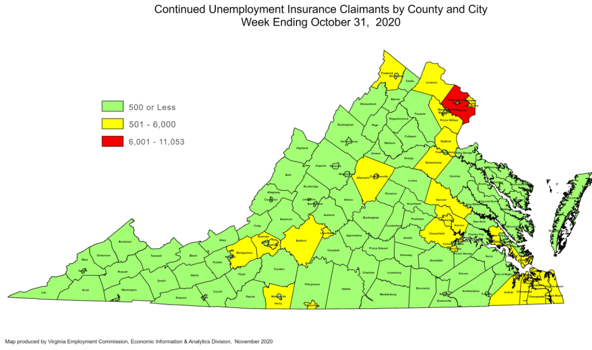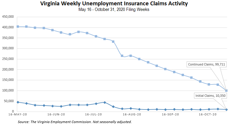 RICHMOND—The Virginia Employment Commission (VEC) announced that the number of continued claims filed during the October 31 filing week was three quarters lower than its May 16 filing week peak, according to figures released today.