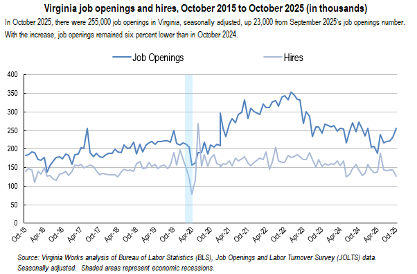 On the last business day in October, there were 255,000 job openings in Virginia, seasonally adjusted, an increase of 23,000 from September s figure of 232,000. Job openings were six percent lower than October 2024 s figure. Nationwide, the number of job openings was unchanged at 7.7 million, in October. The Virginia job openings rate rose to 5.6 percent, its highest level since January of 2025. Nationwide, the job openings rate was unchanged at 4.6 percent.