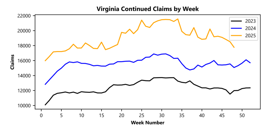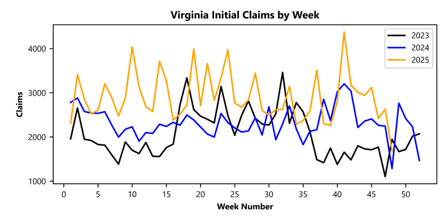RICHMOND— Virginia Works announced today that 1,689 unemployment insurance weekly initial claims were filed during the week ending November 29, 2025, which is 35.7 percent lower than last week’s 2,627 claims and 31.5 percent higher than the comparable week of last year (1,284). Nearly 84 percent of claimants self-reported an employer which correlates to an associated industry. Based on this reporting, the top five industries (60 percent) were Manufacturing (185); Professional, Scientific, and Technical Services (166); Administrative and Support and Waste Management (158); Accommodation and Food Services (129); and Health Care and Social Assistance (99).