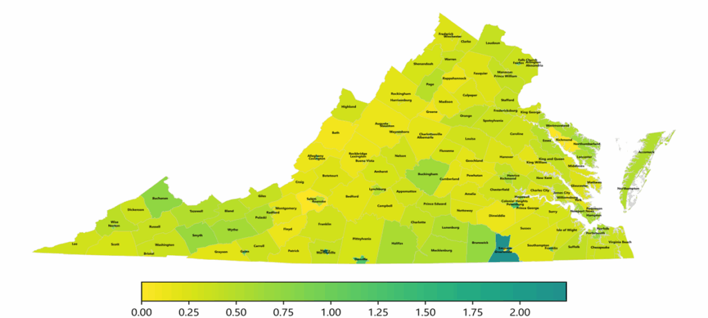 The color-coded map below shows the distribution of this week’s continued claims in Virginia’s counties and cities, expressed as a percentage of each locality’s labor force. This approach provides a more meaningful comparison across areas by adjusting for differences in labor force size. Yellow represents a lower percentage of continued claims relative to the labor force, while progressively darker shades transitioning from yellow to green and dark green indicate higher percentages. The legend at the bottom shows the color spectrum and its corresponding percentage ranges.