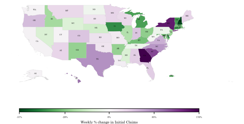 Below is a color-coded map illustrating the percentage change in initial claims from last week to this week across all states nationwide, derived from the latest U.S Department of Labor Weekly Claims News Release (https://www.dol.gov/ui/data.pdf). Green denotes a reduction in continued claims from last week, thus showing improvement, with progressively darker shades of green signifying greater improvement. Purple denotes an increase in continued claims from last week, thus showing deterioration, with progressively darker shades of purple signifying greater deterioration. Very light green, purple or white indicates minimal change from last week. The legend at the bottom provides the color spectrum along with its corresponding percentage value.