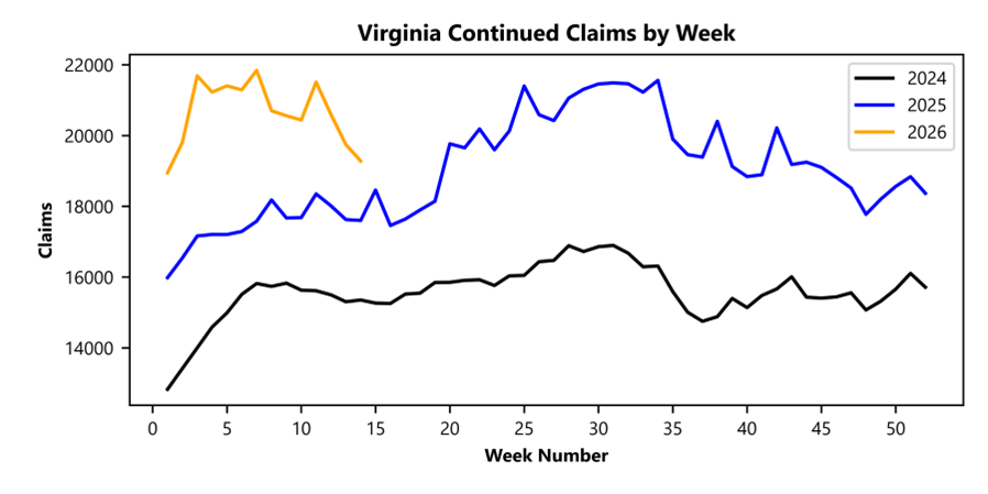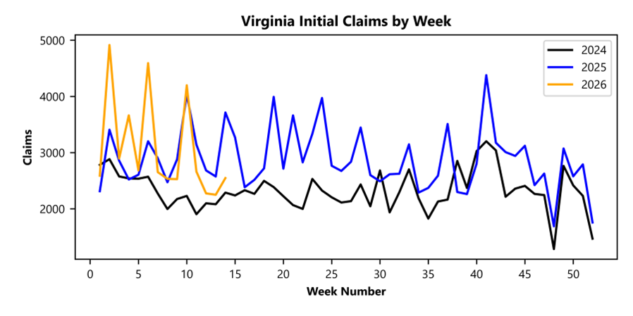 RICHMOND— Virginia Works’ Economic Information and Analytics Division, which serves as the Commonwealth’s official source for labor market and workforce data, reported that that 2,547 unemployment insurance weekly initial claims were filed during the week ending April 04, 2026. The claims were filed with the Virginia Employment Commission, which administers the Commonwealth’s Unemployment Insurance program. This is 13.2 percent higher than last week’s 2,250 claims and 31.4 percent lower than the comparable week of last year (3,714). Nearly 83 percent of claimants self-reported an employer which correlates to an associated industry. Based on this reporting, the top five industries (60 percent) were Professional, Scientific, and Technical Services (385); Administrative and Support and Waste Management (248); Health Care and Social Assistance (225); Retail Trade (200); and Manufacturing (199).