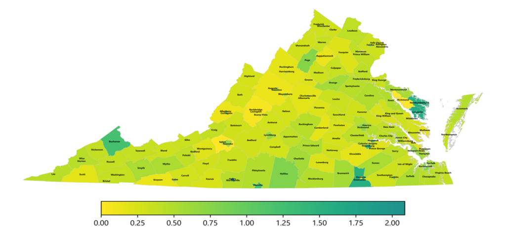 The color-coded map below shows the distribution of this week’s continued claims in Virginia’s counties and cities, expressed as a percentage of each locality’s labor force. This approach provides a more meaningful comparison across areas by adjusting for differences in labor force size. Yellow represents a lower percentage of continued claims relative to the labor force, while progressively darker shades transitioning from yellow to green and dark green indicate higher percentages. The legend at the bottom shows the color spectrum and its corresponding percentage ranges.