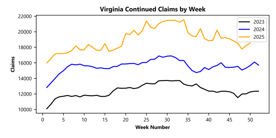 RICHMOND— Virginia Works announced today that 2,578 unemployment insurance weekly initial claims were filed during the week ending December 13, 2025, which is 16.1 percent lower than last week’s 3,073 claims and 6.7 percent higher than the comparable week of last year (2,417).  Nearly 79 percent of claimants self-reported an employer which correlates to an associated industry. Based on this reporting, the top five industries (59 percent) were Administrative and Support and Waste Management (271); Professional, Scientific, and Technical Services (264); Construction (200); Accommodation and Food Services (199); and Health Care and Social Assistance (181).