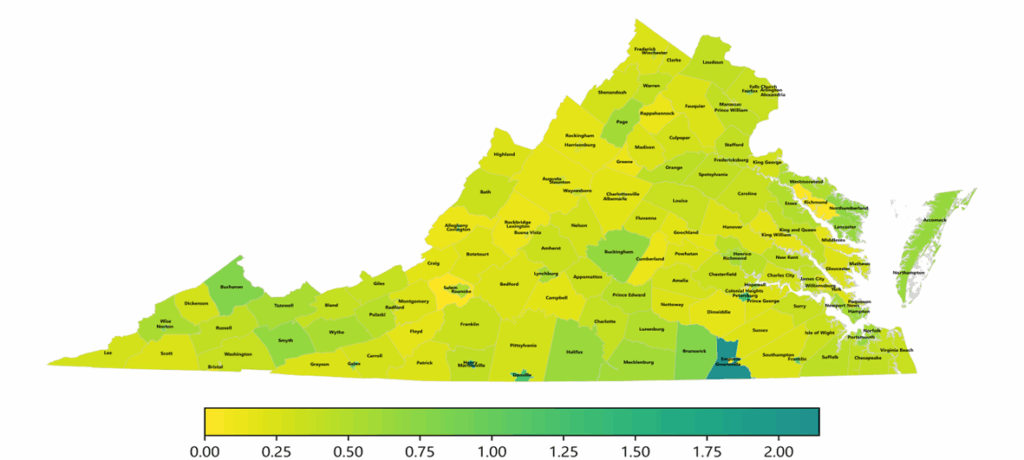 The color-coded map below shows the distribution of this week’s continued claims in Virginia’s counties and cities, expressed as a percentage of each locality’s labor force. This approach provides a more meaningful comparison across areas by adjusting for differences in labor force size. Yellow represents a lower percentage of continued claims relative to the labor force, while progressively darker shades transitioning from yellow to green and dark green indicate higher percentages. The legend at the bottom shows the color spectrum and its corresponding percentage ranges.