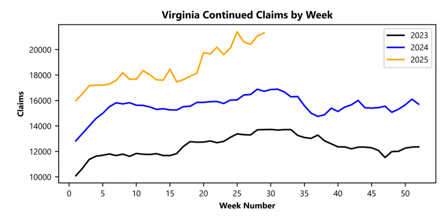 RICHMOND— Virginia Works announced today that 2,600 unemployment insurance weekly initial claims were filed during the week ending July 19, 2025, which is 24.6 percent lower than last week’s 3,446 claims and 27.1 percent higher than the comparable week of last year (2,045). Nearly 79 percent of claimants self-reported an employer which correlates to an associated industry. Based on this reporting, the top five industries (63 percent) were Professional, Scientific, and Technical Services (403); Administrative and Support and Waste Management (252); Manufacturing (203); Retail Trade (202); and Health Care and Social Assistance (198).