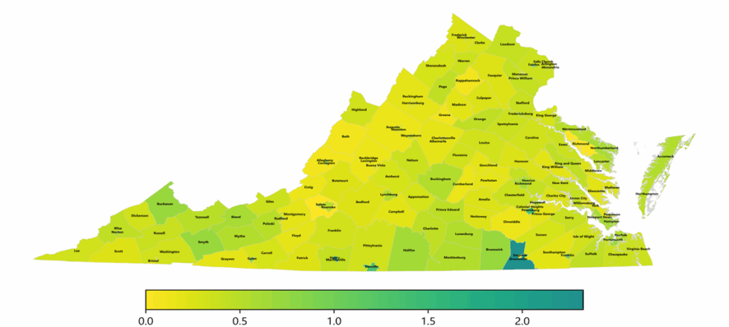 The color-coded map below shows the distribution of this week’s continued claims in Virginia’s counties and cities, expressed as a percentage of each locality’s labor force. This approach provides a more meaningful comparison across areas by adjusting for differences in labor force size. Yellow represents a lower percentage of continued claims relative to the labor force, while progressively darker shades transitioning from yellow to green and dark green indicate higher percentages. The legend at the bottom shows the color spectrum and its corresponding percentage ranges.