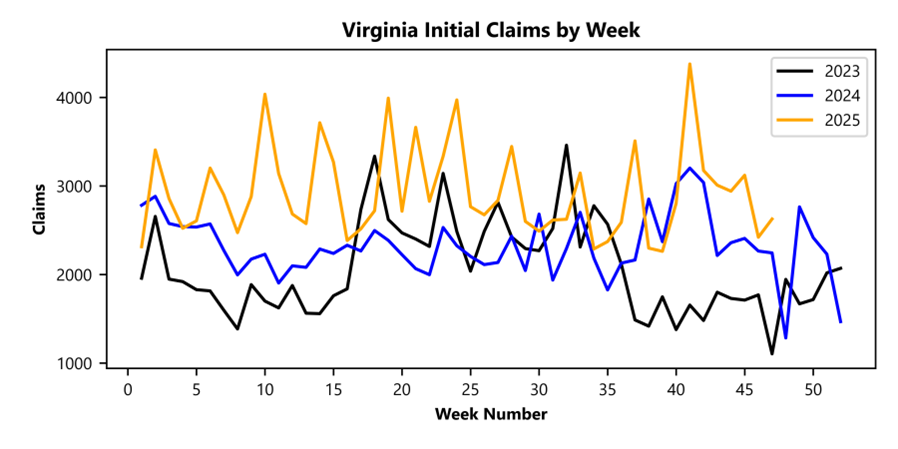 RICHMOND— Virginia Works announced today that 2,627 unemployment insurance weekly initial claims were filed during the week ending November 22, 2025, which is 8.5 percent higher than last week’s 2,421 claims and 17.1 percent higher than the comparable week of last year (2,244). Nearly 81 percent of claimants self-reported an employer which correlates to an associated industry. Based on this reporting, the top five industries (61 percent) were Professional, Scientific, and Technical Services (380); Administrative and Support and Waste Management (277); Health Care and Social Assistance (208); Manufacturing (202); and Retail Trade (191).