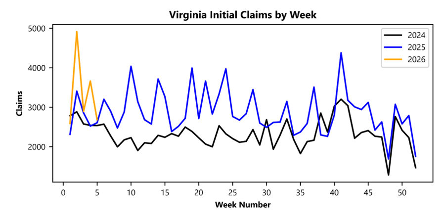 RICHMOND— Virginia Works announced today that 2,683 unemployment insurance weekly initial claims were filed during the week ending January 31, 2026, which is 26.8 percent lower than last week’s 3,663 claims and 3.0 percent higher than the comparable week of last year (2,606). Nearly 80 percent of claimants self-reported an employer which correlates to an associated industry. Based on this reporting, the top five industries (60 percent) were Professional, Scientific, and Technical Services (310); Administrative and Support and Waste Management (263); Construction (219); Health Care and Social Assistance (217); and Manufacturing (207).