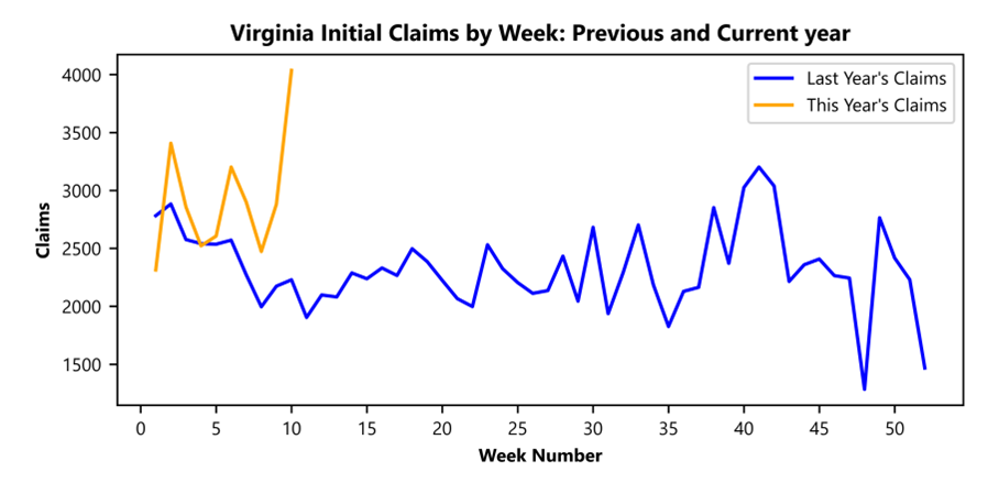 RICHMOND— Virginia Works announced today that 4,036 unemployment insurance weekly initial claims were filed during the week ending March 08, 2025, which is 40.1 percent higher than last week’s 2,881 claims and 81.1 percent higher than the comparable week of last year (2,229). Nearly 66 percent of claimants self-reported an associated industry; of those reported, the top five industries (69 percent) were Manufacturing (619); Professional, Scientific, and Technical Services (509); Administrative and Support and Waste Management (256); Retail Trade (214); and Health Care and Social Assistance (200).
