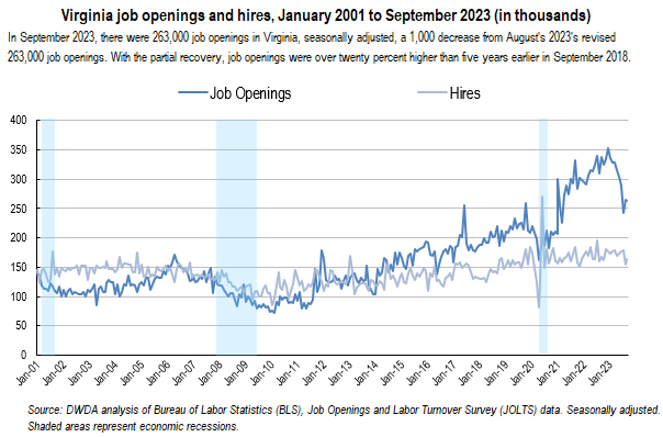 RICHMOND— The Department of Workforce Development and Advancement (DWDA) announced today that the U.S. Bureau of Labor Statistics’ September 2023 Job Openings and Labor Turnover Survey (JOLTS) reports an increase in hires in the Commonwealth.