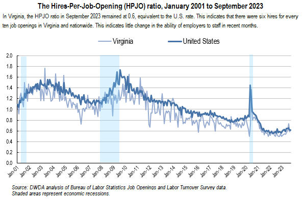 Virginia’s job openings rate edged down 0.1 of a percentage point to 5.9 percent in September. The rate nationwide was unchanged at 5.7 percent.  Significant decreases in job openings rates occurred in Alaska  (-1.3 percentage points), Utah (-0.7 point), and Illinois (-0.6 point). A significant increase occurred in Tennessee (+1.9 points). The job openings rate decreased for establishments with 5,000 or more employees. The number of hires in Virginia rose to 163,000 in September, an increase of 9,000 over the month and up by seventeen percent from September 2018. JOLTS defines hires as all additions to the payroll during the month. The number of hires was up 82,000 from the series low of 81,000 in April 2020. Nationwide in September, the number of hires changed little at 5.9 million. The number of hires changed little in all industries. The largest increases in the hires level occurred in Pennsylvania (+27,000), Ohio (+26,000), and Colorado (+21,000). A large decrease occurred in Texas (-68,000). In Virginia, the hires rate increased to 3.9 percent from August’s revised 3.7 percent rate. In September, the U.S. hires rate was 3.7 percent for the third month in a row. Among the major industries, rate changes were mixed over the month. The hires rate in construction decreased 0.8 percentage point from 4.6 percent in August 2023 to 3.8 percent in September 2023. In trade, transportation, and utilities, the hires rate increased 0.3 percentage point over the month to 4.2 percent. The hires rate significantly increased in Colorado (+0.7 percentage point) and decreased in Texas (-0.5 point). In September 2023, the Virginia ‘annual fill’ rate (the ratio of ‘this month’ hires to ’last month’ job openings, over the year) remained significantly above the historical, typical level of 1.0 at 1.14. The fill rate is a measure used to evaluate how labor markets differ in the pace that job openings are filled. An annual fill rate near or above 1.0 can indicate that employers are growing more efficient at filling job openings. On the other hand, an annual fill rate of less than 1.0 can indicate a tighter labor market, with employers having greater difficulty filling job openings compared to a year earlier. Going back to 2001, the highest annual fill rate occurred during May 2020 because, after the nationwide shutdown due to the COVID-19 pandemic, employers across the country sought to quickly hire for vacated positions. The lowest fill rate in Virginia occurred in June 2021. During that time, there were many factors that hindered the filling of vacant positions by employers, such as health concerns, employee skills, and childcare needs, but the biggest factor was the comparison against the historic re-hiring hike the year before.