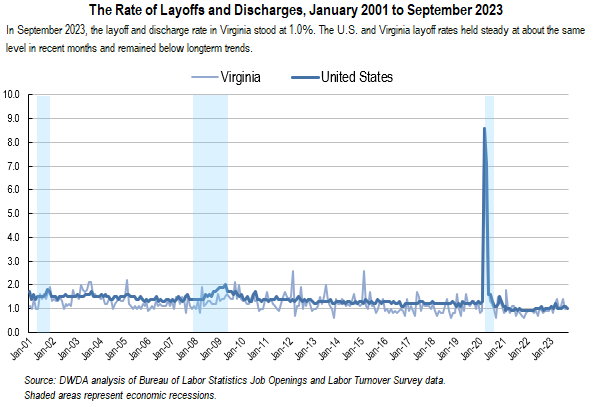 The number of layoffs and discharges in Virginia was unchanged at 40,000 in September. This was an increase of twenty-one percent over the year, but still at low, pre-Pandemic levels. Layoffs and discharges are countercyclical, which means that layoffs typically increase during economic contractions and decrease during economic expansions. In September, the number of U.S. layoffs and discharges changed little at 1.5 million. The number of layoffs and discharges significantly decreased in state and local government education (-22,000). The largest decreases in the layoffs and discharges level occurred in Illinois (-53,000) and in Arizona and Wisconsin (-12,000 each). The Virginia layoffs and discharges rate was also unchanged at one percent, while the rate of layoffs and discharges nationwide was little changed at 1.0 percent. The largest decreases in layoffs and discharges rates occurred in Alaska (-1.6 percentage points), Illinois (-0.9 point), and Connecticut (-0.5 point).