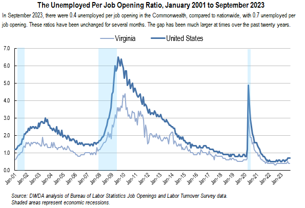 In September 2023, there were four unemployed workers per ten job openings in the Commonwealth, within the 0.4 range that it has hovered around since 2021. That period marked the lowest rates since January 2001, when BLS began collecting the data. In Virginia, the unemployed per job opening ratio (sometimes called the ‘job seekers ratio’) peaked at 4.4 unemployed per job opening in February 2010 during the Great Recession. The number of unemployed workers per job opening stood at 3.2 in April 2020 during the height of pandemic employment impacts. Across the U.S., there was a ratio of unemployed people to job openings of 0.7 in September, unchanged over the month. The ratio of unemployed people per job opening has been below 1.0 since July 2021. The number of unemployed people per job opening nationwide reached its highest level of 6.5 in July of 2009, at the height of the Great Recession.