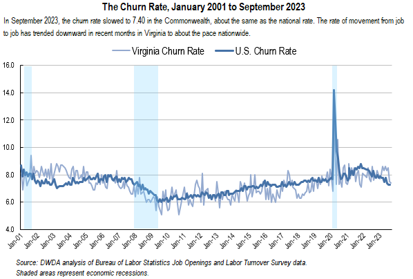 The September 2023 churn rate (the sum of the hires rate and the total separations rate) slowed significantly to 7.4 from August’s revised 7.5 rate in Virginia yet indicating still-elevated velocity of rotation into and out of jobs. Nationwide’s churn rate was 7.2, which was little changed over the month but a 0.7-point deceleration over the year. An elevated churn rate indicates a labor market with a high hires rate, a high separations rate, or both. It can signify that workers are moving more frequently into and out of jobs in the labor market. Conversely, a low churn rate indicates a labor market with a low hires rate, a low separations rate, or both. Labor markets with the most churn may also have more seasonal employment patterns not fully captured by seasonal adjustment factors, which can lead to more frequent job-to-job movement.
