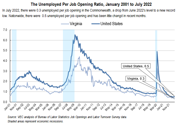 The number of July 2022 job openings in Virginia was 344,000 and was a 14,000 increase from June’s 2022’s revised figure, exceeding the record 340,000 reached in March of this year. The U.S. number of job openings was little changed at 11.2 million on the last business day of July 2022. The number of job openings increased in transportation, warehousing, and utilities (+81,000); arts, entertainment, and recreation (+53,000); federal government (+47,000); and state and local government education (+42,000). Job openings decreased in durable goods manufacturing (-47,000).  The Virginia job openings rate (job openings as a percentage of total employment) matched March’s 7.8% but was slightly lower than the series high of 7.9% set in September 2021. In July, the U.S. job openings rate was little changed at 6.8%