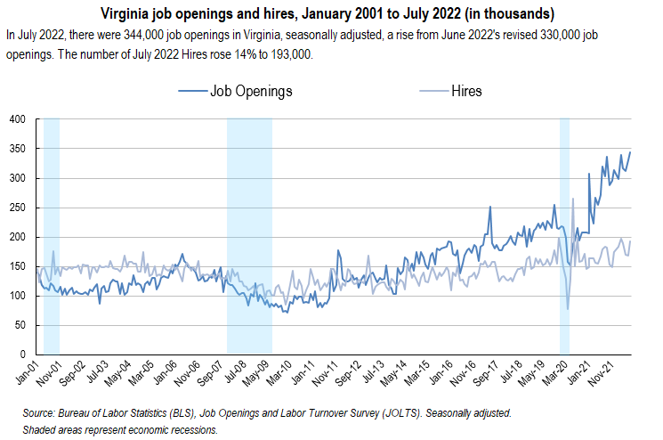RICHMOND— The Virginia Employment Commission announced today the U.S. Bureau of Labor Statistics’ July 2022 Job Openings and Labor Turnover Survey (JOLTS) reports Virginia job openings rose to a record-high 344,000. With hires increasing by 24,000 in July, Virginia had the largest increase in workers in the nation.