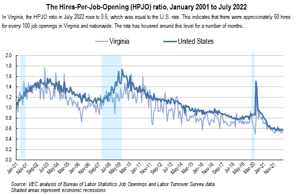 2022 JOLTS figures show yet another month of a hot job market in which workers were able to consider multiple options and employers were still eager to hire. This was evidenced in the number of workers quitting their jobs. In every month going back a year, at least 100,000 Virginia workers left their job if you count February’s 97,000 figure. This has never happened before, going back to 2001. Over 70% of total separations in July were quits and may be an indication of continued worker confidence in their chances to find a better job. At the same time, both hires and job openings continued to greatly exceed the number of quits nationwide, with Virginia hiring especially resilient in July. Many believe that the U.S. economy is slowing down, but hiring managers didn’t seem to agree. Employers have struggled to build back their staffs to where they want them. An explanation for this may be that, now that they have employees again, employers want to hold on to them, refraining from additional layoffs to hedge their bets to not have churn again, which is so costly.