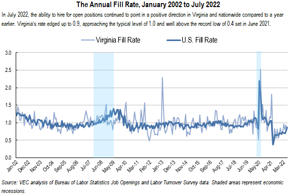 In July 2022, the ‘annual fill’ rate (the ratio of ‘this month’ hires to ’last month’ job openings, over the year) rebounded to 0.9 from the revised June’s figure of 0.8. The U.S. annual fill rate was little changed at 0.9. This indicates, in Virginia, a trend in recent month towards less difficulty in filling positions when compared to a year earlier. The fill rate is a measure used to evaluate how labor markets differ in the pace that job openings are filled. An annual fill rate near or above 1.0 can indicate that employers are growing more efficient at filling job openings. On the other hand, an annual fill rate of less than 1.0 can indicate a tighter labor market, with employers having greater difficulty filling job openings compared to a year earlier.