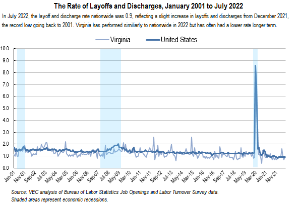 The number of layoffs and discharges in Virginia rebounded by 7,000 to 36,000 in July 2022 from June’s revised 29,000 figure. This was an increase of a third over the year, but nearly 15% lower than five years before in 2018. In July, the number of layoffs and discharges nationwide was little changed at 1.4 million after hitting a series low in April from data going back to January 2001. Layoffs and discharges were little changed in all industries. The layoffs and discharges rate increased in establishments with 250 to 999 employees but decreased in establishments with 1,000 to 4,999 employees. The largest increases in layoffs and discharges rates occurred in Mississippi (+0.6 percentage point), Minnesota (+0.5 point), and Ohio (+0.4 point). Layoffs and discharges are countercyclical, which means that layoffs typically increase during economic contractions and decrease during economic expansions.