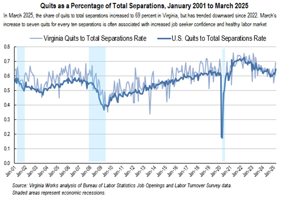 An estimated 88,000 workers quit jobs from Virginia employers in March. The number of job quits was 15 percent lower compared to March 2024. Nationwide in March, the number of quits was little changed at 3.3 million. U.S. quits decreased in transportation, warehousing, and utilities (-49,000). The quits rate in the Commonwealth was 2.1 percent. Over the month, the U.S. quits rate was little changed at 2.1 percent. The February ‘churn’ rate (the sum of the hires and total separations rates) in Virginia fell by 0.6 of a percentage point from February’s revised 6.9 percent figure and was driven by a decrease in job separations. It was slower than the U.S. churn rate of 6.6 percent, which was little changed over the month.