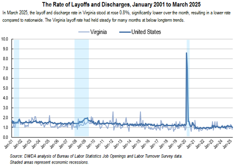 RICHMOND— Virginia Works (the Virginia Department of Workforce Development and Advancement) announced today that the U.S. Bureau of Labor Statistics’ March 2025 Job Openings and Labor Turnover Survey (JOLTS) reports a decrease in job layoffs and discharges.