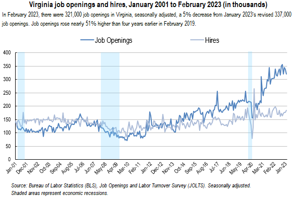 RICHMOND— The Virginia Employment Commission announced today that the U.S. Bureau of Labor Statistics’ February 2023 Job Openings and Labor Turnover Survey (JOLTS) reports steady hiring with low numbers of layoffs in the Commonwealth.