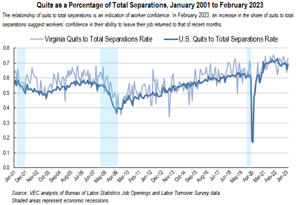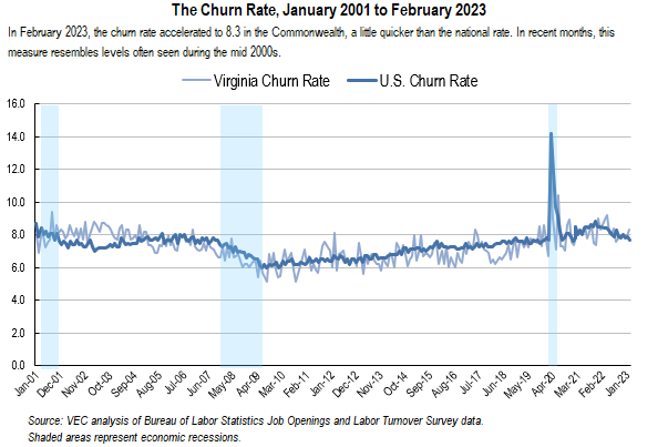 The February 2023 churn rate (the sum of the hires rate and the total separations rate) accelerated to 8.3 from January’s revised 7.9 rate in Virginia, indicating continued elevated velocity of rotation into and out of jobs, picking up pace slightly from recent months. Nationwide performed a little differently, as the U.S. churn rates slowed slightly and showed some deceleration over the year. An elevated churn rate indicates a labor market with a high hires rate, a high separations rate, or both. It can signify that workers are moving more frequently into and out of jobs in the labor market. Conversely, a low churn rate indicates a labor market with a low hires rate, a low separations rate, or both. Labor markets with the most churn may also have more seasonal employment patterns not fully captured by seasonal adjustment factors, which can lead to more frequent job-to-job movement.