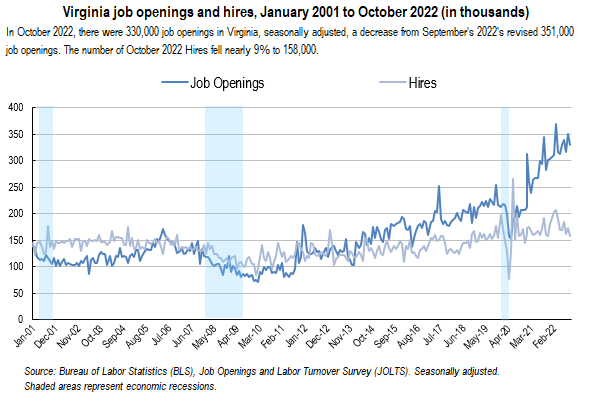 The number of October 2022 job openings in Virginia was 330,000, which was a 21,000 decrease from September’s 2022’s revised figure but reflected continued tautness in labor markets seen across the country. Nationwide, the number of job openings edged down to 10.3 million on the last business day of October. Job openings decreased in state and local government, excluding education (-101,000); nondurable goods manufacturing (-95,000); and federal government (-61,000). The number of job openings increased in other services (+76,000) and in finance and insurance (+70,000). The Virginia job openings rate (job openings as a percentage of total employment) fell by half of a percentage point to 7.4 but remained very elevated. The U.S. rate edged down to 6.3 percent in October and was a full percentage point lower than its peak in March of this year.
