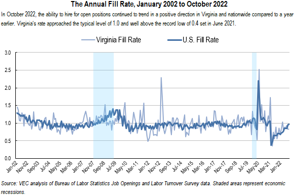 In October 2022, the ‘annual fill’ rate (the ratio of ‘this month’ hires to ’last month’ job openings, over the year) approached the level of 1.0. The U.S. annual fill rate edged slightly lower but was still near 1.0. This indicates a trend in recent months towards less difficulty in filling positions when compared to a year earlier. The fill rate is a measure used to evaluate how labor markets differ in the pace that job openings are filled. An annual fill rate near or above 1.0 can indicate that employers are growing more efficient at filling job openings. On the other hand, an annual fill rate of less than 1.0 can indicate a tighter labor market, with employers having greater difficulty filling job openings compared to a year earlier. Going back to 2001, the highest annual fill rate occurred during June 2020 because, after the nationwide shutdown due to the COVID-19 pandemic, employers across the country sought to quickly hire for vacated positions. The lowest fill rate in Virginia occurred in June 2021. During that time, there were many factors that hindered the filling of vacant positions by employers, such as health concerns, employee skills, and childcare needs, but the biggest factor was the comparison against the historic re-hiring hike the year before.