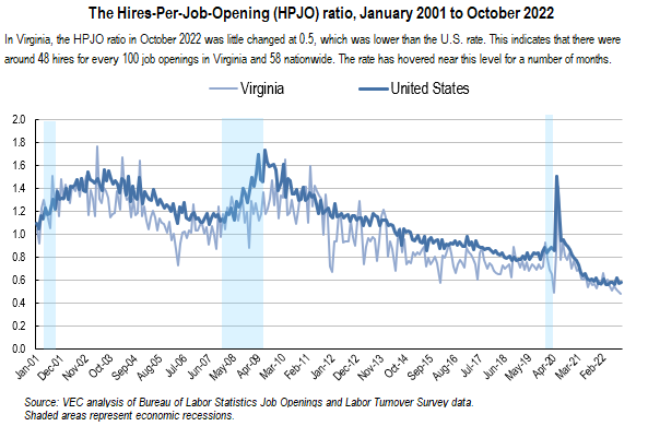 The hires-per-job-openings (HPJO) ratio was little-changed at 0.5 in October, lower than the 0.6 rate nationwide. This measure shows the rate of hiring compared to open jobs and is a proxy for time to fill positions. In 2022, the rate has hovered around one hire for every two job openings in Virginia and in the Commonwealth.