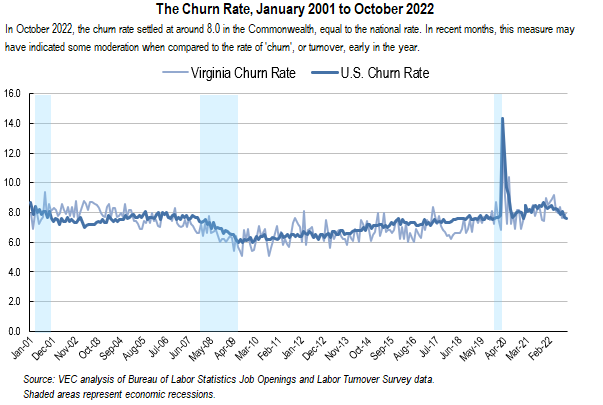 The October 2022 churn rate (the sum of the hires rate and the total separations rate) rose slightly to 7.9 from September’s revised 7.8 rate in Virginia, indicating continued elevated velocity of movement into and out of jobs but a little slower than earlier in the year. Nationwide performed similarly, as the U.S. churn rate slowed slightly over the month and signaled deacceleration from early 2022. An elevated churn rate indicates a labor market with a high hires rate, a high separations rate, or both. It can signify that workers are moving more frequently into and out of jobs in the labor market. Conversely, a low churn rate indicates a labor market with a low hires rate, a low separations rate, or both. Labor markets with the most churn may also have more seasonal employment patterns not fully captured by seasonal adjustment factors, which can lead to more frequent job-to-job movement.