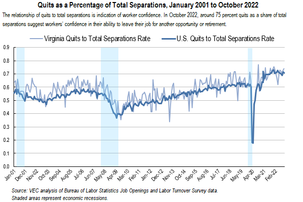 The trend of large numbers of Virginians quitting their jobs continued, according to BLS JOLTS figures for October. Three quarters of job separations were quits, indicating continued confidence among job changers and reluctance on the part of employers to lose staff given the difficulties in filling job openings. Is this trend caused solely by the Great Resignation—an outcome of Covid era labor market disruptions? Partially, but quitting has comprised a growing portion of separations since the Great Recession of 2007-2009. The dislocation of 2020 and 2021’s subsequent reordering of labor markets heightened it. However, quitting trends in 2022 appear to resume a decade-long trajectory, driven by secular demographic and technological trends and the changing nature of jobs.