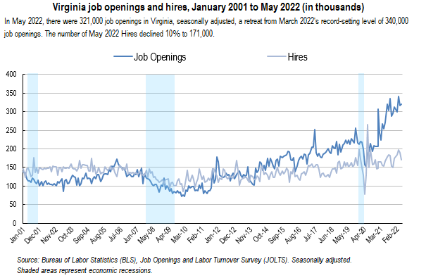 RICHMOND— According to the U.S. Bureau of Labor Statistics’ May 2022 Job Openings and Labor Turnover Survey (JOLTS), Virginia job openings were up over 25% from a year earlier.