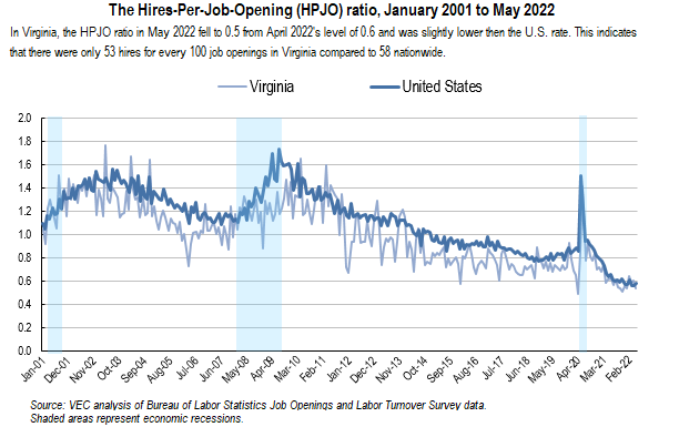 The hires-per-job-openings (HPJO) ratio decreased to 0.5 in May in Virginia, slightly lower than the rate nationwide. This measure shows the rate of hiring compared to open jobs and is a proxy for time to fill positions. Over five years, the ability to hire for job openings has fallen by nearly a third nationwide but the decline has been less severe in Virginia.