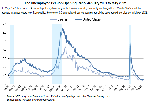 In May 2022, there was less than one (0.4) unemployed worker per job opening in the Commonwealth, holding steady over the last few months. This period marked the lowest rate since January 2001, when BLS began collecting the data. In Virginia, the unemployed per job opening ratio (sometimes called the ‘job seekers ratio’) peaked at 4.4 unemployed per job opening in February 2010 during the Great Recession, while the number of unemployed workers per job opening stood at 3.3 in April 2020 during the height of pandemic employment impacts.