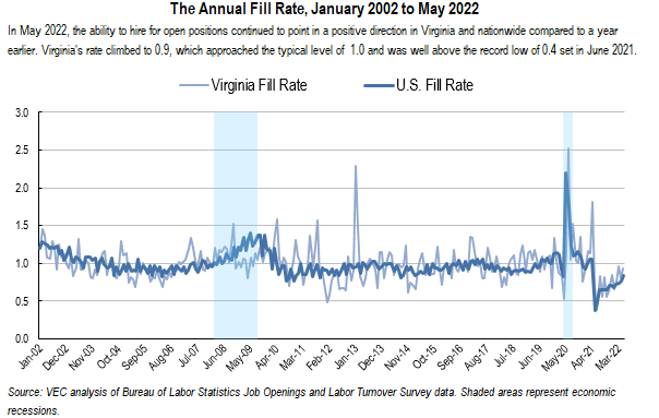 In May 2022, the ‘annual fill’ rate (the ratio of ‘this month’ hires to ’last month’ job openings, over the year) rose to 0.9 from the revised April figure of 0.8. The U.S. annual fill rate was little changed at 0.8. This indicates, in Virginia, a trend in recent month towards less difficulty in filling positions when compared to a year earlier. The fill rate is a measure used to evaluate how labor markets differ in the pace that job openings are filled. An annual fill rate near or above 1.0 can indicate that employers are growing more efficient at filling job openings. On the other hand, an annual fill rate of less than 1.0 can indicate a tighter labor market, with employers having greater difficulty filling job openings compared to a year earlier.