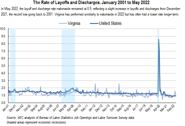 The number of layoffs and discharges in Virginia decreased by 23,000 to 40,000 in May 2022 from April’s revised 63,000 figure. This was a reduction of 17% over the year, but 14% higher than five years before in 2018. In May, the number of layoffs and discharges nationwide nudged higher during the month to 1.39 million after hitting a series low in April from data going back to January 2001. Layoffs and discharges increased in wholesale trade (+24,000) and in federal government (+4,000). The number of layoffs and discharges increased in 5 states and decreased in 4 states in May. Nationally, the number of layoffs and discharges was little changed over the month. In May, the U.S. layoff and discharge rate was unchanged at 0.9 percent. Layoffs and discharges rates decreased in 7 states and increased in 4 states. The largest decreases in layoffs and discharges rates occurred in Virginia (-0.6 percentage point). Layoffs and discharges are involuntary separations initiated by the employer. Layoffs and discharges are countercyclical, which means that layoffs typically increase during economic contractions and decrease during economic expansions.