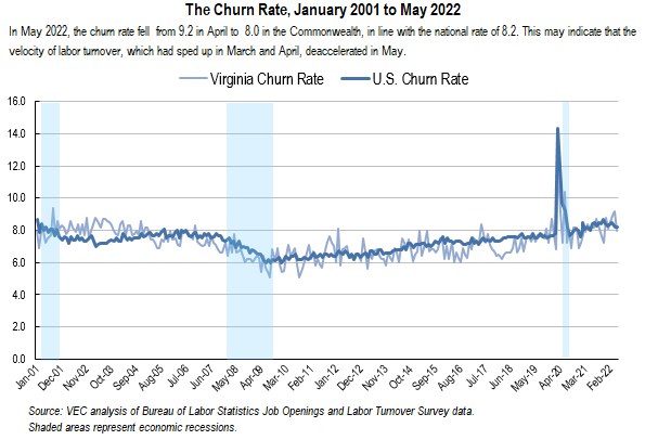 The decline of the May 2022 churn rate (the sum of the hires rate and the total separations rate) to 8.0 from April’s revised 9.2 in Virginia indicated continue elevated velocity of movement into and out of jobs, to a pace of labor market turnover not seen since the pandemic summer of 2020. Nationwide, the movement of the April 2022 churn rate held steady at 8.2, indicating continued elevated velocity heading into the summer of 2022. An elevated churn rate indicates a labor market with a high hires rate, a high separations rate, or both. It can signify that workers are moving more frequently into and out of jobs in the labor market. Conversely, a low churn rate indicates a labor market with a low hires rate, a low separations rate, or both. Labor markets with the most churn may also have more seasonal employment patterns not fully captured by seasonal adjustment factors, which can lead to more frequent job-to-job movement.
