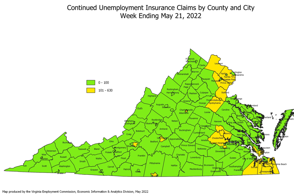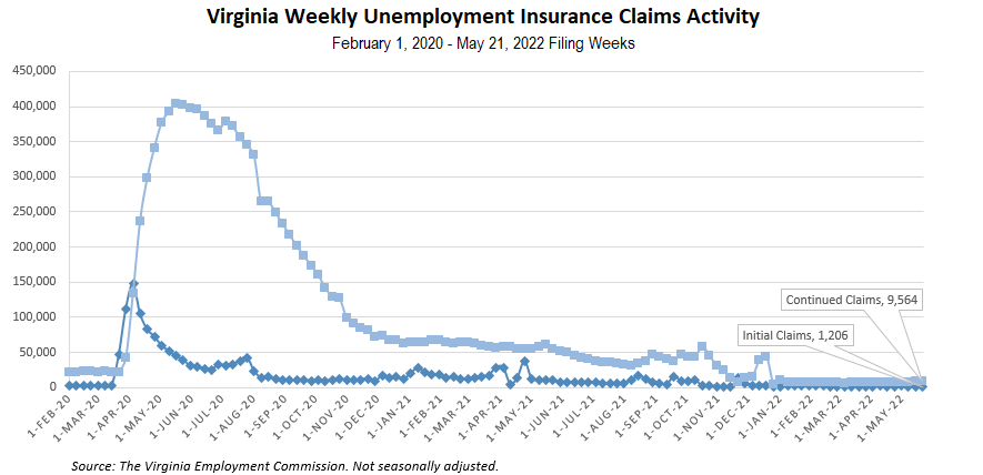 For the filing week ending May 21, the figure for seasonally unadjusted initial claims in Virginia was 1,206. The latest claims figure was a decrease of 95 claimants from the previous week. Over half of initial claims that had a self-reported industry were in accommodation and food services, health care and social assistance, administrative and waste services, and retail trade. Eligibility for benefits is determined on a weekly basis, and so not all weekly claims filed result in a benefit payment. This is because the initial claims numbers represent claim applications; claims are then reviewed for eligibility and legitimacy.