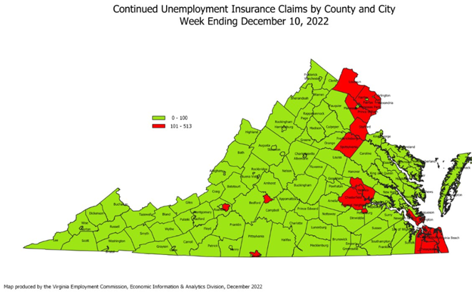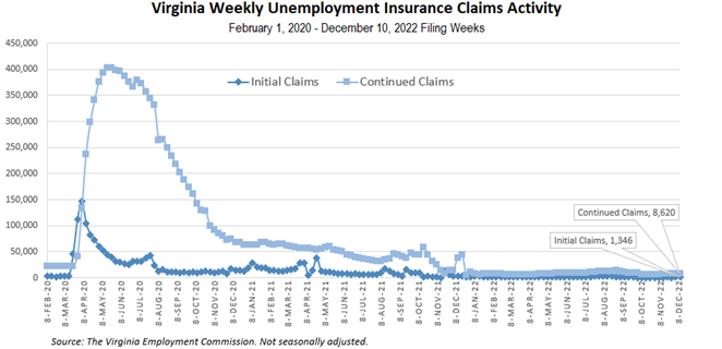 For the filing week ending December 10, the figure for seasonally unadjusted initial claims in Virginia was 1,346, which is an increase of 135 claimants from the previous week. Over half of initial claims with a self-reported industry from administrative support and waste management, construction, professional, scientific, and technical services, retail trade, and health care and social assistance. Continued weeks claimed totaled 8,620, which was an increase of 721 claims from the previous week, but a reduction of 78% from the 38,389 continued claims from the comparable week last year.
