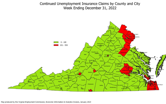 For the filing week ending December 31, the figure for seasonally unadjusted initial claims in Virginia was 1,361, which is an increase of 172 claimants from the previous week. Over half of initial claims with a self-reported industry from manufacturing, construction, accommodation and food services, and administrative support and waste management. Continued weeks claimed totaled 9,545, which was an increase of 259 claims from the previous week, but a reduction of 15% from the 11,262 continued claims from the comparable week last year.