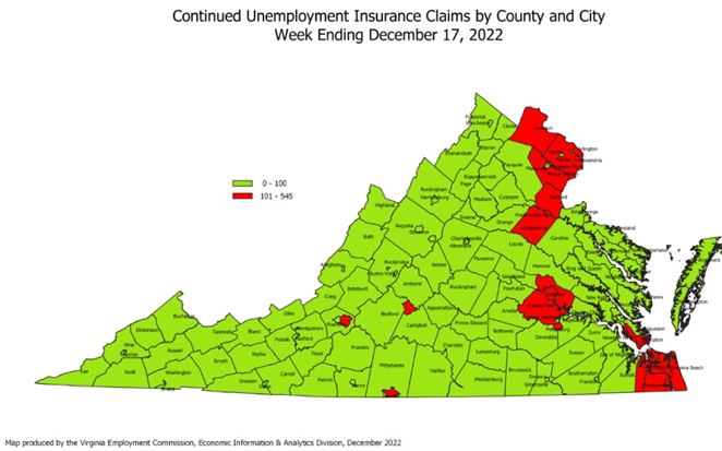 For the filing week ending December 17, the figure for seasonally unadjusted initial claims in Virginia was 1,457, which is an increase of 111 claimants from the previous week. Over half of initial claims with a self-reported industry from administrative support and waste management, accommodation and food services, construction, manufacturing, and retail trade. Continued weeks claimed totaled 9,027, which was an increase of 407 claims from the previous week, but a reduction of 80% from the 44,270 continued claims from the comparable week last year.