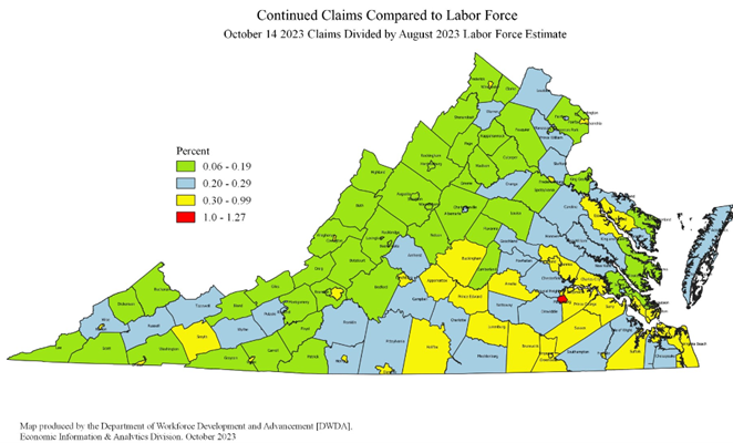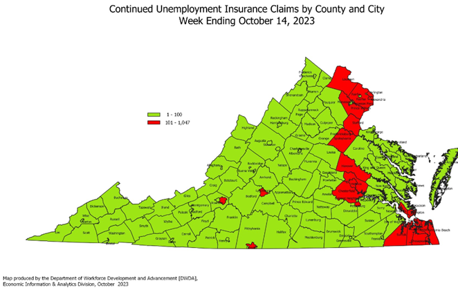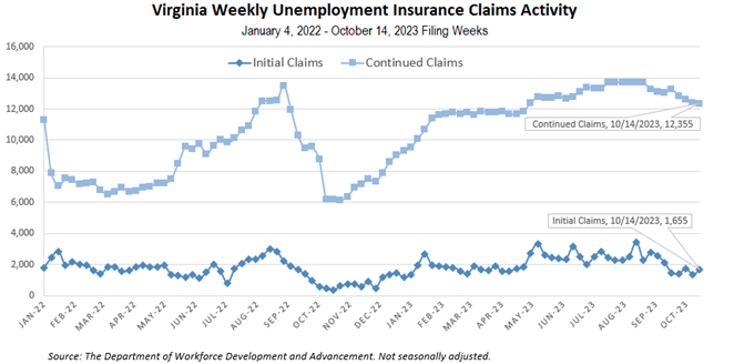 For the filing week ending October 14, the figure for seasonally unadjusted initial claims in Virginia was 1,655, which was an increase of 277 claimants from the previous week. Continued weeks claimed totaled 12,355, which was five claims lower than the previous week but an increase of 100% from the 6,159 continued claims from the comparable week last year. An industry was reported for ninety-three percent of claimants. Of those, over half (53 percent) of continued claims were from professional, scientific, and technical services (1,865), administrative and support and waste management (1,673), manufacturing (1,461), and health care and social assistance (1,120). Eligibility for benefits is determined on a weekly basis, and so not all weekly claims filed result in a benefit payment. This is because the initial claims numbers represent claim applications; claims are then reviewed for eligibility and legitimacy.
