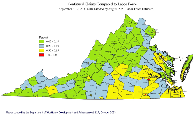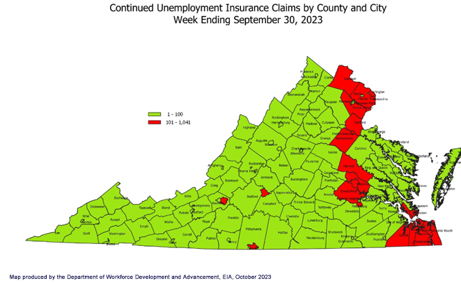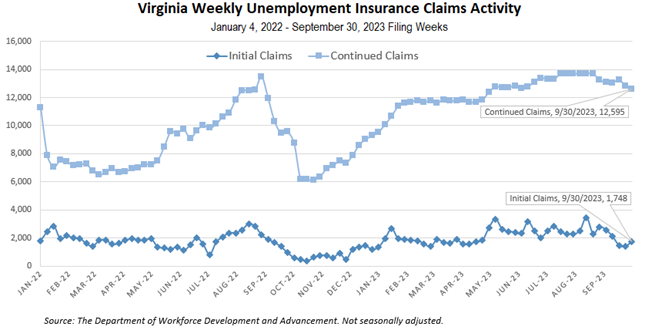 For the filing week ending September 30, the figure for seasonally unadjusted initial claims in Virginia was 1,748, which was an increase of 331 claimants from the previous week. Continued weeks claimed totaled 12,595, which was 235 claims lower than the previous week but an increase of 43.9% from the 8,754 continued claims from the comparable week last year. An industry was reported for ninety-three percent of claimants. Of those, over half (53 percent) of continued claims were from professional, scientific, and technical services (1,908), administrative and support and waste management (1,712), manufacturing (1,465), and health care and social assistance (1,120). Eligibility for benefits is determined on a weekly basis, and so not all weekly claims filed result in a benefit payment. This is because the initial claims numbers represent claim applications; claims are then reviewed for eligibility and legitimacy.